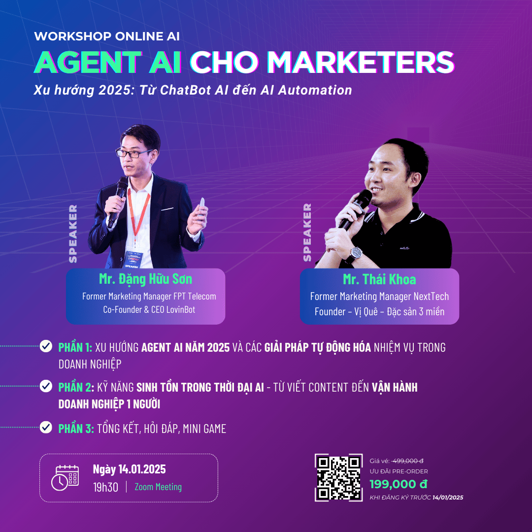 Workshop sẽ có sự tham gia của Speaker Đặng Hữu Sơn – CEO LovinBot AI, Phó Chủ Tịch Liên Minh Phát Triển Nguồn Nhân Lực AIID và khách mời.